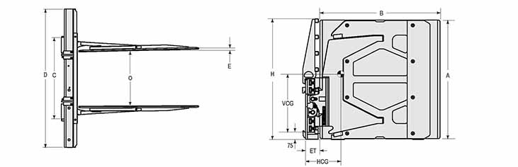 Capacity 承載能力(kg) | Catalog Order NO 型號 | Mounting Class 安裝等級 | Load Center載荷中心(mm) | Opening Range張臂范圍(mm) | Arm Height臂高A(mm) | Arm Length臂長B(mm) | Arm Thickness臂厚E(mm) | Overall Width總寬D(mm) | Overall Height總高H(mm) | Vertcial Center Of Gravity垂直重心VCG(mm) | Hook Spread上鉤外側(cè)間距(mm) | Weight 自重(kg) | Effective 失載距ET(mm) | Horizontal Center of Gravity 水平重心CGH(mm) |