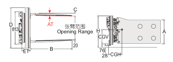 Capacity 承載能力(kg) | Catalog Order NO 型號(hào) | Mounting Class 安裝等級(jí) | Opening Range張臂范圍(mm) | Arm Height臂高A(mm) | Arm Length臂長(zhǎng)B(mm) | Arm Thickness臂厚C(mm) | Overall Height總高H(mm) | Frame Width 框架寬度D(mm) | Arm Toe in內(nèi)扣量AT(見(jiàn)注5)(mm) | Weight 自重(kg) | Effective 失載距ET(mm) | Horizontal Center of Gravity 水平重心CGH(mm) |